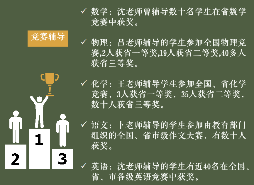 大多教师在辅导学生学科竞赛也卓有成效,尤其是数学、物理、化学和语文、英语。