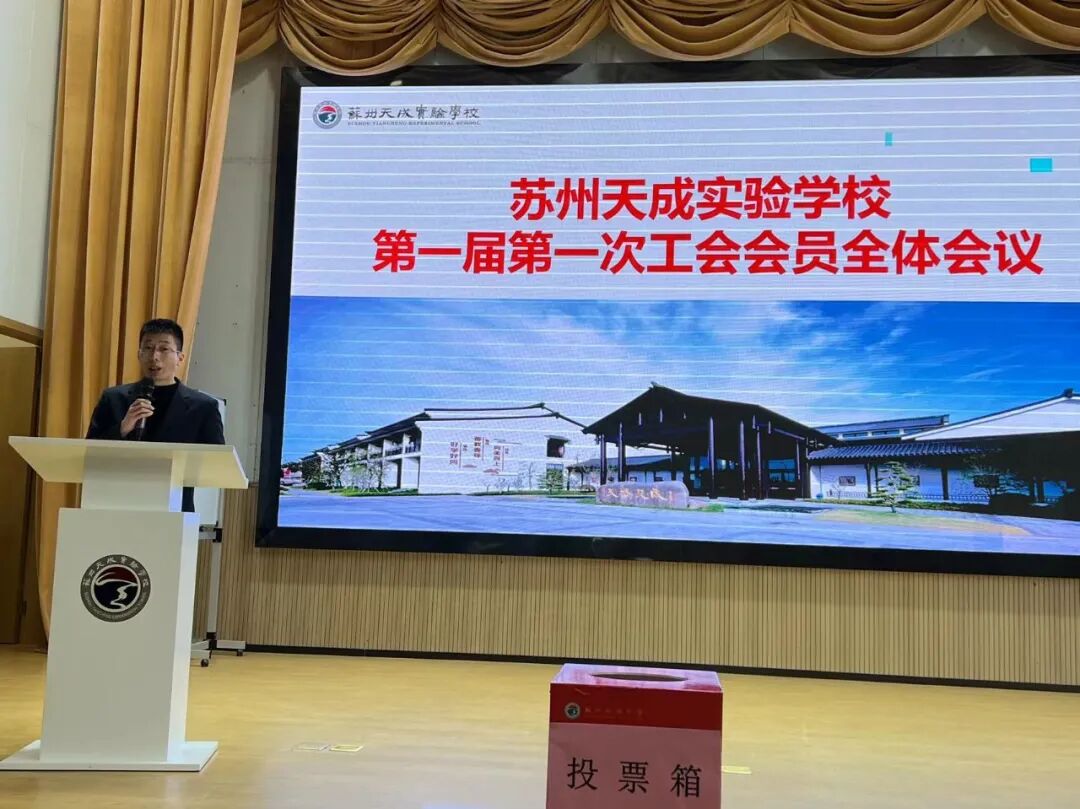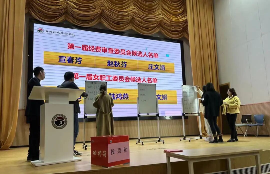 2021年11月23日,苏州天成实验学校工会第一次全员大会在学校报告厅召开,大会通过不记名投票方式选举出工会委员、工会审计员和妇女职工代表。